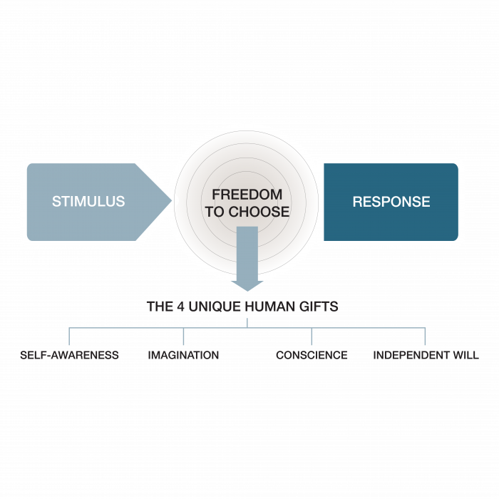 Toutes ces forces extérieures agissent comme des stimuli auxquels nous répondons. Entre le stimulus et la réponse se trouve notre plus grand pouvoir : nous avons la liberté de choisir notre réponse. L’une des choses les plus importantes que nous choisissons est ce que nous disons. Notre langage est un bon indicateur de la façon dont nous nous percevons.