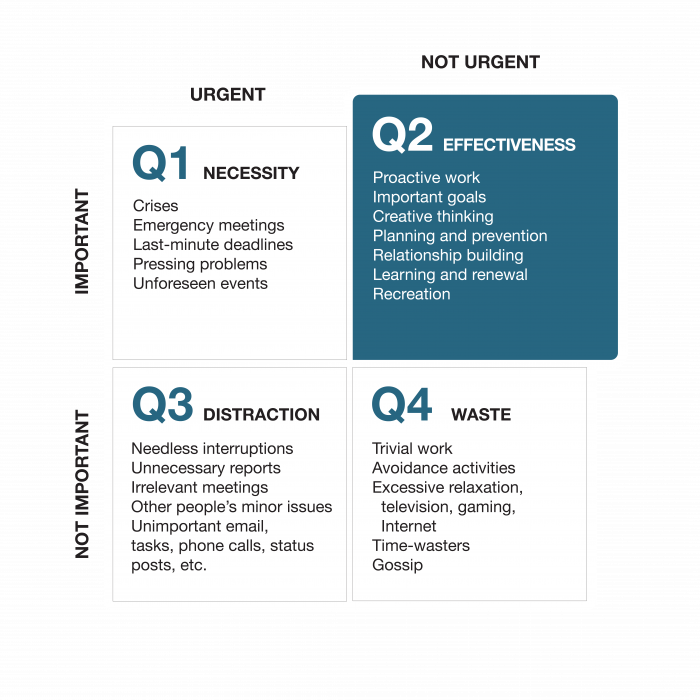 Nous passons notre temps de l’une des quatre façons suivantes, en fonction des deux facteurs qui définissent une activité : urgent et important. Urgent signifie qu’elle requiert une attention immédiate. Les choses urgentes agissent sur nous et sont généralement visibles. Par exemple, un téléphone qui sonne est urgent. Les choses importantes, en revanche, ont trait aux résultats. Elles contribuent à notre mission, à nos valeurs et à nos objectifs prioritaires. Nous réagissons aux questions urgentes. Les choses importantes qui ne sont pas urgentes exigent plus d’initiative, plus de proactivité.