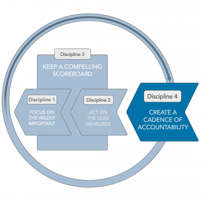 Avec la Discipline 4, les équipes partagent la responsabilisation. Les engagements ne sont pas seulement pris entre les leaders et leurs équipes, ils sont pris entre les individus au sein des équipes. En respectant leurs engagements hebdomadaires, les membres de l’équipe influencent l’indicateur prédictif qui, à son tour, permet de prévoir la réussite de l’indicateur de résultat du EOI®.